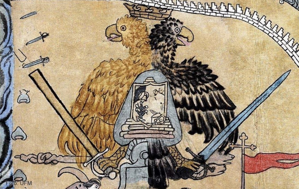 | Águila bicéfala imperial del Códice Quauquechollan, documento náhuatl del s. XVI que narra la conquista de Guatemala. La mitad izquierda sujeta un macuahuitl, y la mitad derecha una espada europea. Conservado en el Museo Regional de Cholula, en Puebla, México (imagen de https://pbs.twimg.com/media/DtxEZBVVYAAvyz0.jpg:large) |